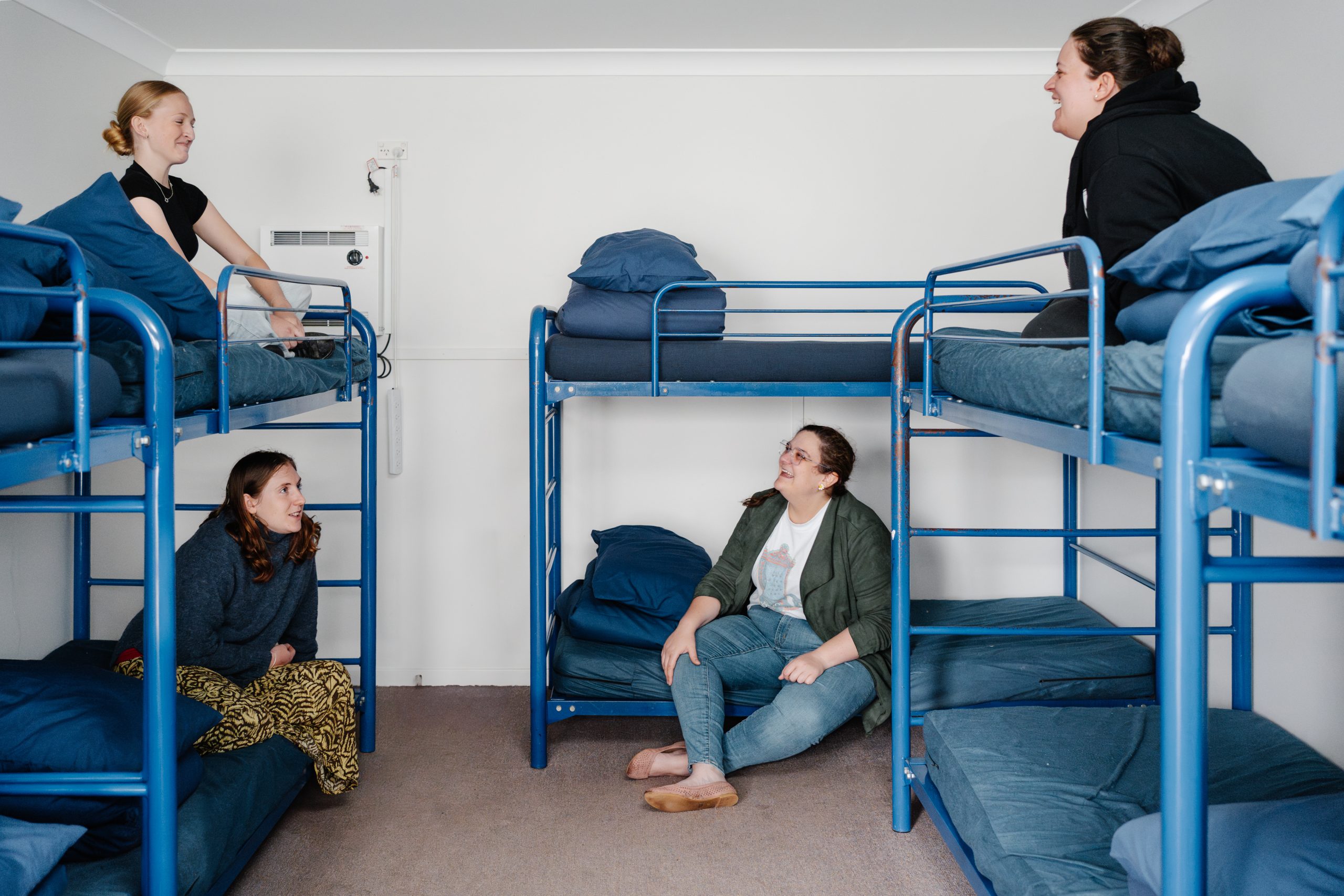 Dorm-style accommodation with bunks for 6-10 people per room.